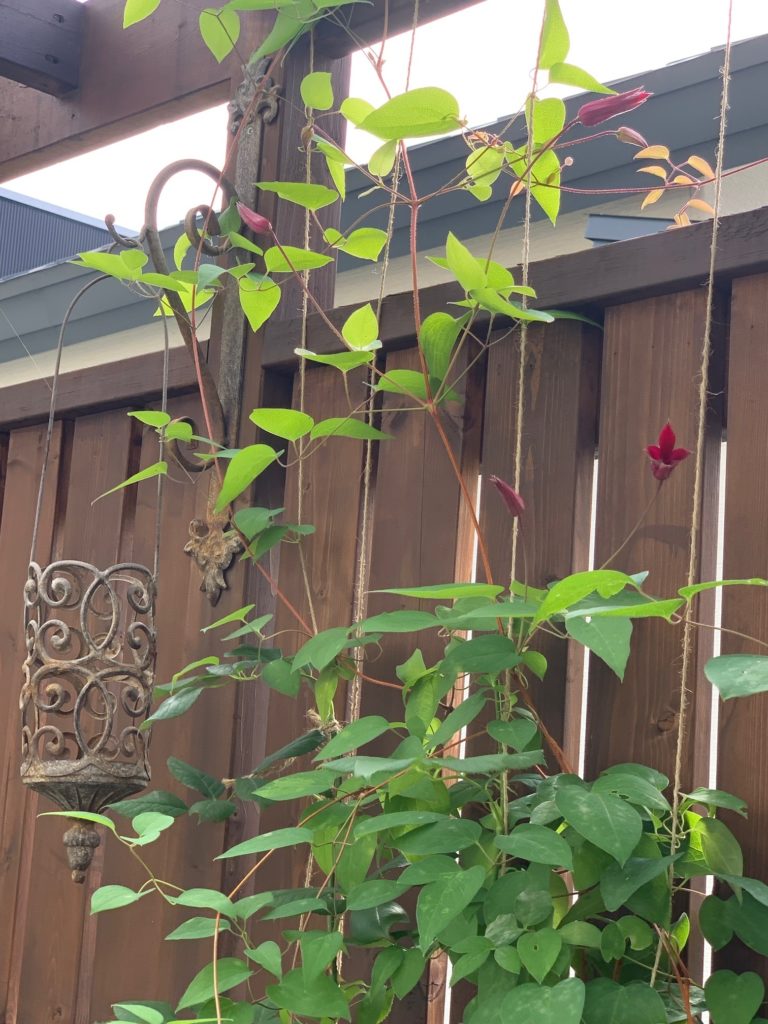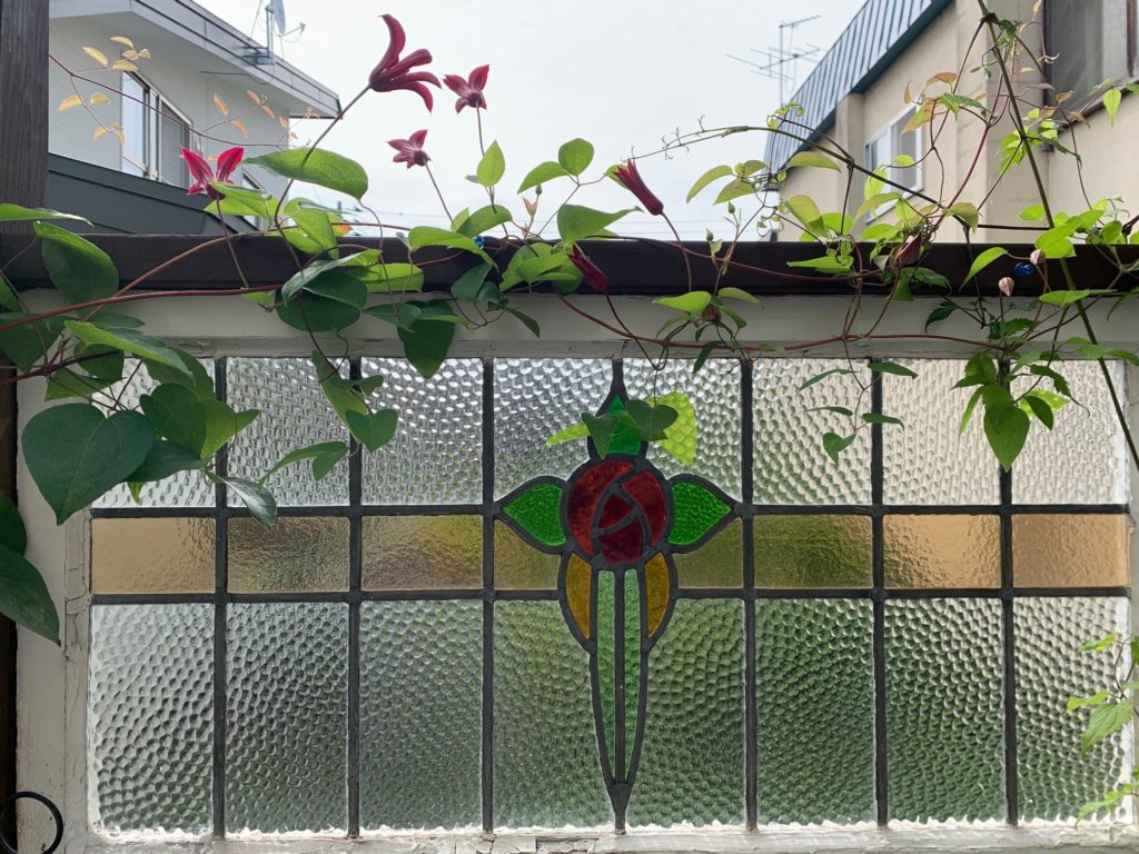 ステンドグラスのまわりで、クレマチス グレイブタイビューティーが咲き始めました。