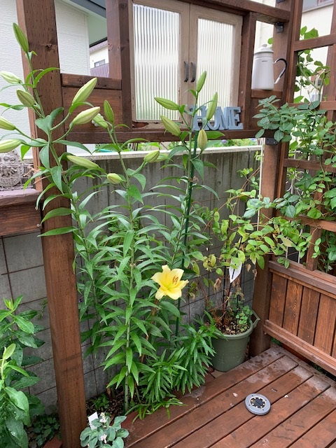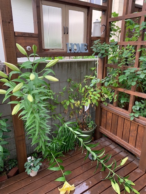 このパーゴラ付きウッドデッキはちょっと和の要素を取り入れたくて、昨年DIYしたエリアです。ユリやクレマチス・ロウグチなどちょっと渋めの植物を植えています(*´▽`*)