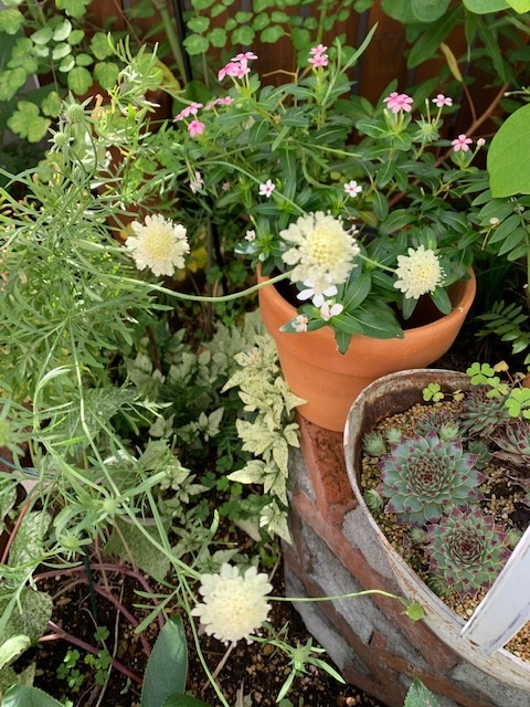 ヨレヨレのスカビオサ'ムーンダンス'(左)と センペルビウム(右)