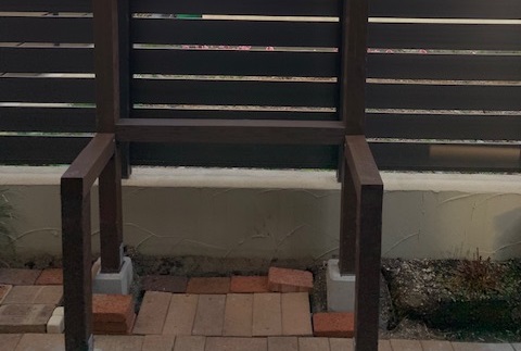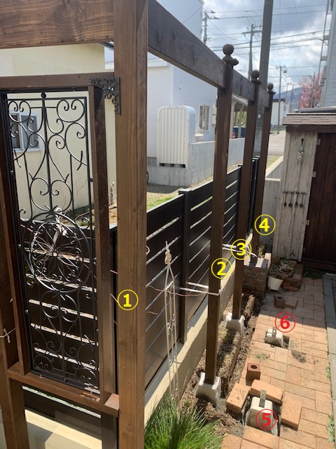 手前の脚(⑤⑥)もしっかりと束石(つかいし)を使って基礎をつくることで、高いフェンスを補強する役割も果たしていますよ(^_-)-☆