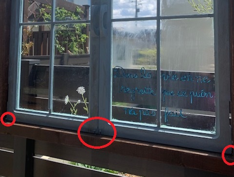 なるべく目立たないようにビスで止めています。ビスは窓には貫通しておらず、裏側に止めてある細い木材とこのビスで、窓を挟んでとめている感じです。