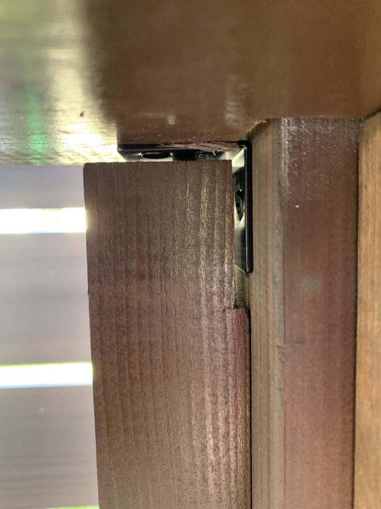 黒いL字金具は、スーパービバホームで1つ78円で売っている優れもの。金具の幅が38mmで、ツーバイ材を止めるのにちょうどいいです。