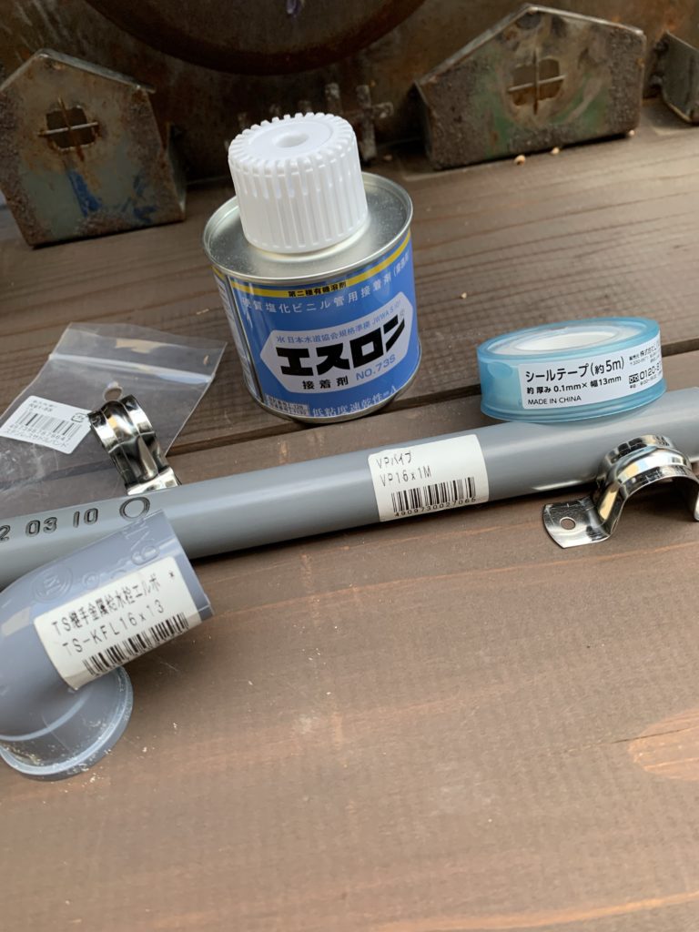 シールテープ、塩ビ管接着用のエスロン、固定金具も買いました。