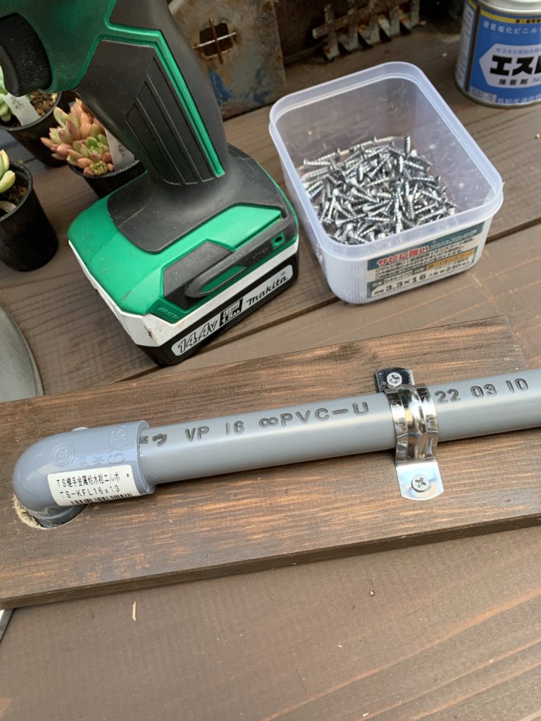 まず1×4に穴をあけ、写真のようにセットします。エルボと塩ビ管の接続部分には、エスロンを塗ります。