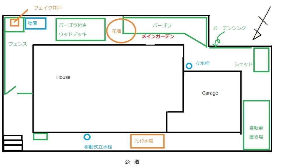 家と庭の配置はこんな感じです。↓ (2022年8月現在)