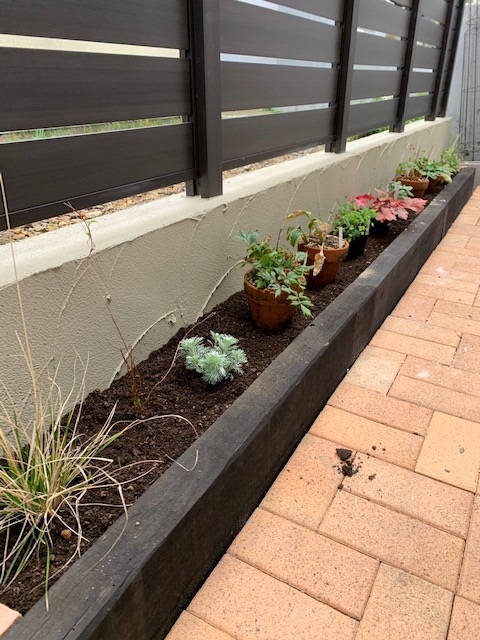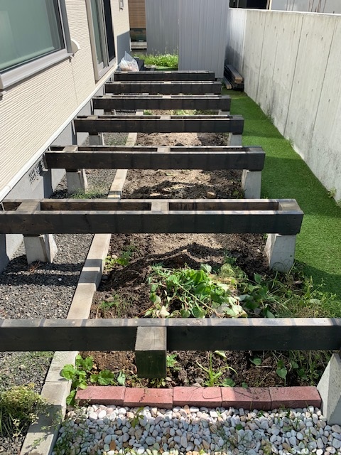 ハーフサイズの枕木で花壇を作りました。狭いお庭はちょっとのスペースも無駄にできません(^_^)